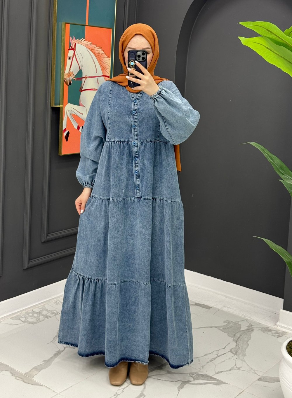 Düğmeli Kot Elbise - Mavi